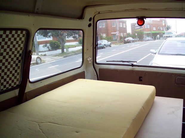 Luego, coloque cajones estratégicamente y coloque la tabla en la parte superior. Rellenar las cajas con botellas de agua (imprescindible para mi furgoneta que a veces se dobla como una piscina de hidromasaje de alto rendimiento), herramientas, gato, refrigerante, (como arriba) y otra mierda ajena. Esto Cargúelos abajo un poco más, ya que el arreglo entero tienden a saltar en el espejo retrovisor cuando se navega por baches. Sin embargo, una vez que usted Embale el resto de la basura - tablas de surf y kite engranaje y tres metros cuadrados de arena - debajo de la plataforma, se moverán alrededor de menos.
