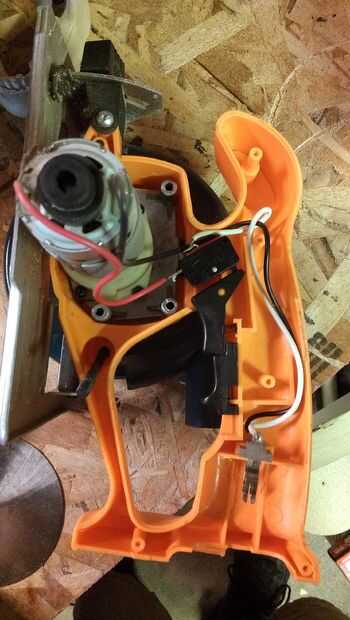 Así que ahora tenía esta gran idea para la mini Sierra de conversión. Delante de mí por un segundo y me olvidé acerca de cómo fue vamos a encender esto. Pensamiento bien que puedo sujetar al gatillo de debajo, pero pensé que esto sería una mala idea en caso de que necesitaba la apague rápido. Así que tuve que hacer un cambio exterior.