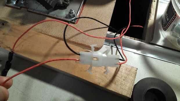 Cuidadosamente, quité la carcasa para hacer nota de la configuración del cableado y cómo su connceted a la batería y el interruptor. Marcó y cortar los cables uno a la vez y añadido 20" del nuevo cable connceting correr hacia atrás n adelante. Pido disculpas por no conseguir más fotos de los cables de sí mismos. Usé un 2 clavijas Conector de Radio Shack para fácil plug n play.
