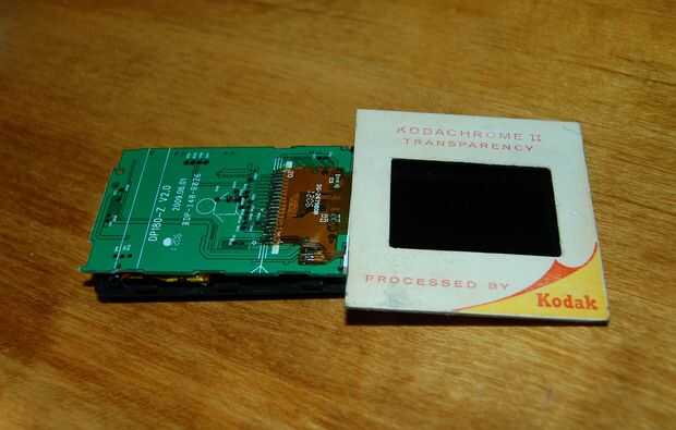 Una vez que se toma el aro aparte puedes ONU-fold el LCD de la placa de circuito. Esto es necesario para que puedas desde el proyector de luz por la parte posterior de la pantalla LCD en lugar de utilizar el construido en luces LED. En la mayoría de LCDs hay varias capas de material en la parte posterior de la pantalla del canal y reflejan la luz a través de la pantalla LCD. Estos deben eliminarse para que la pantalla es transparente. La placa de circuito tendrá que colocarse en el caso de la pantalla "abrir". Para hacer este corte una ranura cortada en la caja de plástico, pero asegúrese de que está lo suficientemente apretada como para que cuando el caso fue montado con la pantalla LCD exterior que las dos mitades sostenga el borde de la pantalla LCD que no tienes que preocuparse por agregar estructura para mantener la pantalla. Usted puede ahora pruebe la colocación de la diapositiva Kodak sobre el LCD.