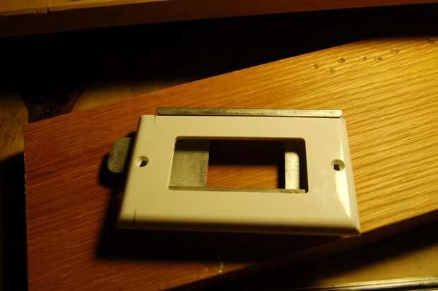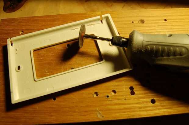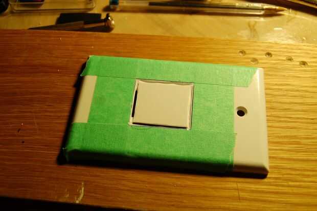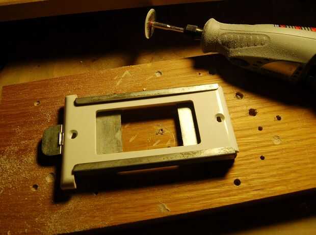 he utilizado placas de interruptor de luz de plástico para montar la pantalla LCD como eran baratos y fáciles de conseguir y también el espesor adecuado. Con una dremel que corte la placa de ajuste en el soporte de accesorio original de Leica. La primera placa da una plataforma de montaje y la segunda placa mantenga la pantalla LCD. Una vez que las placas se cortan spray con martillado metálico acabado pintura en aerosol que coinciden con el acabado de pintura en el proyector vintage.