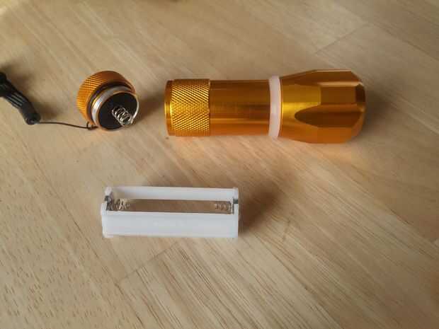 Tenía una linterna que contiene 4 leds.Trabajó en cuatro celdas de botón de 1 voltio.Cada blanco led puede tomar hasta 3 voltios. Por lo tanto 4 leds podría tomar hasta 12 voltios.Decidí eliminar las células de cuatro botón y añadir una batería de 9