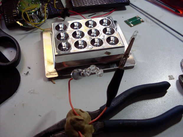 de salida de luz equivalente de una bombilla de halógeno de 70 Watts pero solamente uses12 vatios de potencia.Haz tiros muestran un edificio en la noche 100-ft distancia iluminada por esta luz LED bicicleta.Detalladas especificaciones y lista de piez
