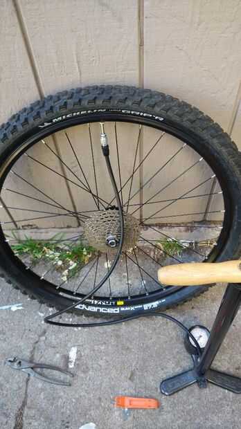 - Montar el otro lado de la llanta y asegúrese de que el grano del neumático no pellizque el tubo. Puede ser necesario volver a utilizar las palancas del neumático.