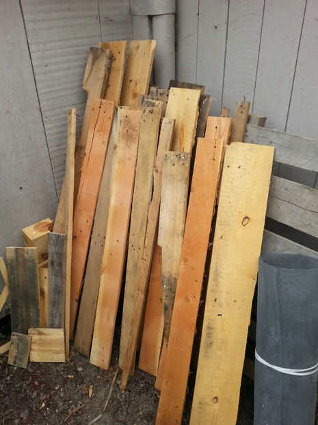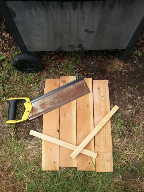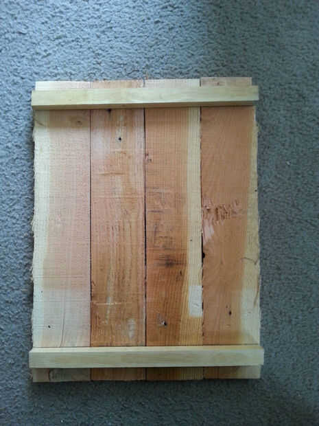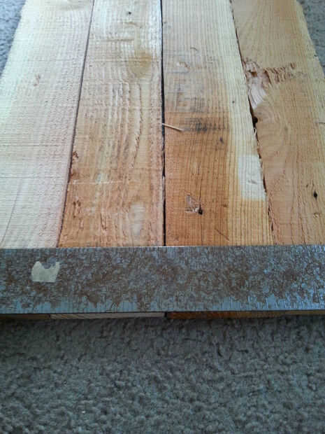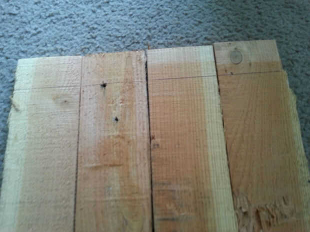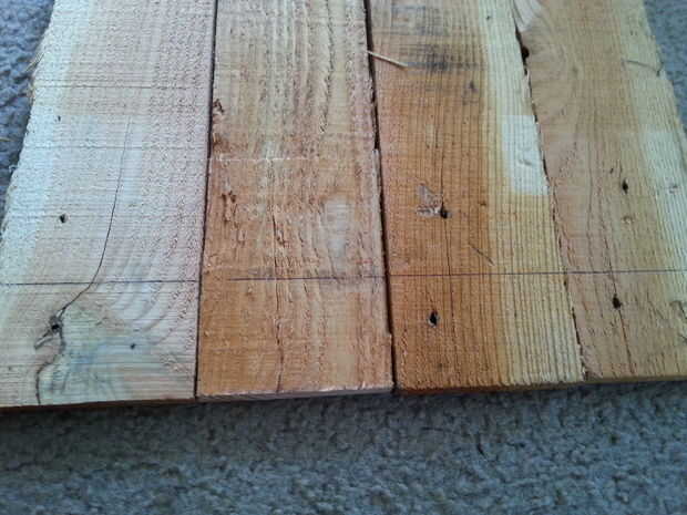 recoger la madera de la plataforma de su elección. (Asegúrese de quitar todos los clavos) Las piezas que escogí fueron 3.5" de ancho, y corté hasta 18" de longitud. (sólo parecía adecuado) Terminé con ocho tarjetas de 18 "X 3,5". También corta algunos restos de madera para hacer cuatro placas de 14 "X 1". Las dimensiones de la mesa son de 18 "X 14". Los tableros se unirá con dos 14 "X 1" a lo largo de la parte superior e inferior.