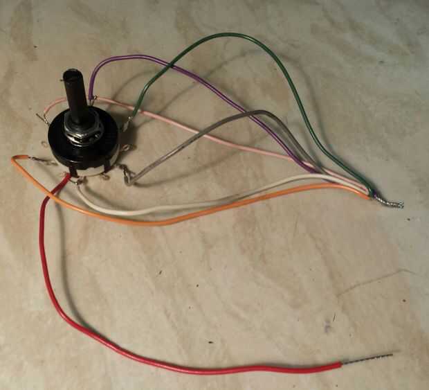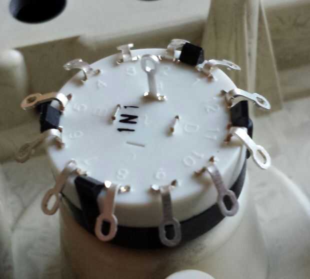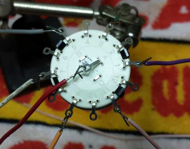 En primer lugar tratan la sintonización rotatorio - cómo utilizar el giro del dial para imitar la acción de empuje-interruptor momentáneo que el circuito de TV estaba esperando para cambiar la fuente de AV. He conseguido este usando un interruptor rotatorio de 12 forma unipolar, con alternativas terminales conectados al mismo cable (ver foto). Esto significa que el disco al girar el interruptor se mueve entre Estados abiertos y cerrados, así como el micro original podría ser presionado repetidamente para recorrer las fuentes AV.