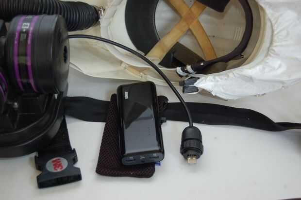 El Anker viene con una bolsita de malla. No sé por qué alguien utilizaría esto en la vida normal, pero me solucionó el problema de cómo asegurar la batería: sólo cosí la bolsa directamente sobre la banda del PAPR. La bolsa ofrece la voluntad de la batería un mínimo de protección y tiene un pequeño lazo que mantendrá la batería de caer hacia fuera cuando estoy trabajando en un ángulo extraño.