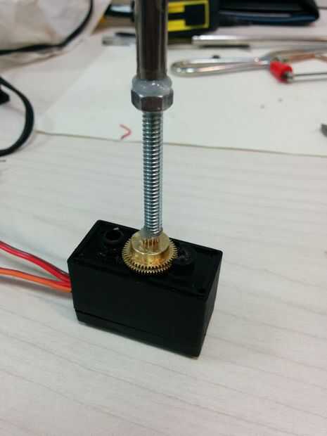 Los engranajes fueron originalmente sujeta por dos varillas metálicas. En la parte superior del servo, tome el más corto de los dos y coloque en el centro. Entonces, se usa para deslizar el engranaje del metal combinado que hemos creado antes en su lugar. Atornille la varilla roscada en el tubo de metal.