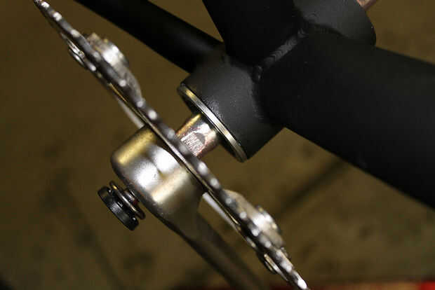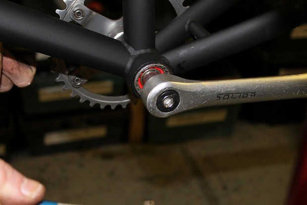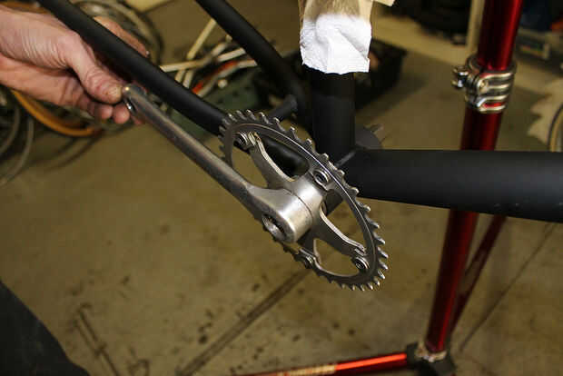 Empuje la mano derecha la manivela en el huso. Como estamos instalando nuevas manivelas en esta bicicleta hay una posibilidad de que la manivela o el anillo de la cadena puede frotar en el marco. Como se puede ver en la foto 1 de este paso, nuestro despeja, aunque apenas.