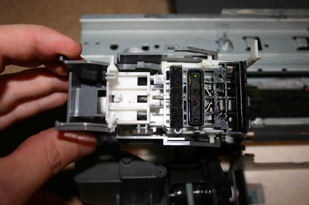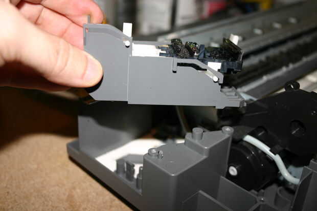 Finalmente usted querrá quitar el cabezal de impresión estación de limpieza. Usted querrá tener cuidado aquí! Esta estación simplemente sale de los conectores de presión que está sentado en el, pero tendrá un sistema de tubería conectado a él. Este tubo es necesario así que asegúrese de no romper o quitar. Una vez que tenga esas tres cosas quitadas podemos empezar a mirar el corazón de la modificación de esta impresora, el proceso de elevación.