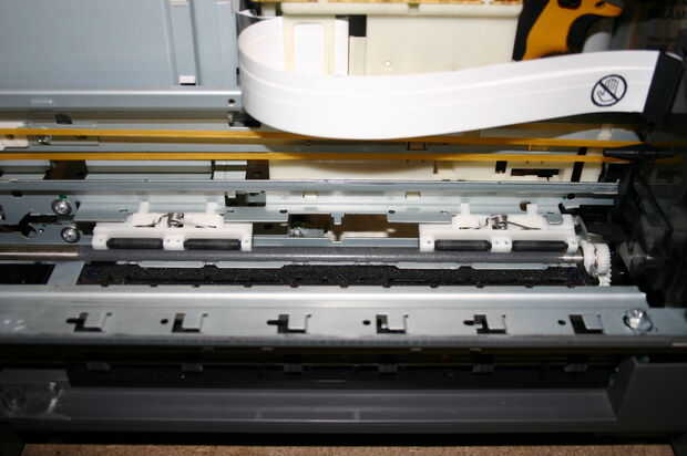 El siguiente es hasta las ruedas de la presión en el centro de la impresora. Usted realmente no necesita todos los conjuntos de tres y el conjunto de centro podría causar problemas de separación cuando envías una tarjeta de circuitos a través de la impresora. Así que para evitar este problema simplemente quité el rodillo dejando un área clara para el tablero del circuito pase a través.