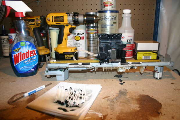 Este paso es opcional dependiendo de qué forma es la impresora en, pero mina fue un poco mayor ya había sentado decidí limpiar el cabezal de impresión. Este es un proceso bastante fácil ya que ahora han quitado todo el conjunto sólo puede colocarlo en la mesa durante la limpieza de la cabeza. Mi cabeza de impresión se seca bastante y tenía un montón de tinta atascada en él he hecho algunas investigaciones para averiguar la mejor manera de quitarlo. Lo que encontré que la mejor sugerencia fue utilizar algunos bastoncillos de algodón para golpear algunos de la mugre más grande apagado antes de rociar el hisopo de algodón con vidrios Windex limpiador para realmente quitar la tinta seca hacia fuera de todas las superficies. Como se puede ver en la imagen que he utilizado bastantes esponjas de algodón para limpiar el cabezal de impresión realmente bien.