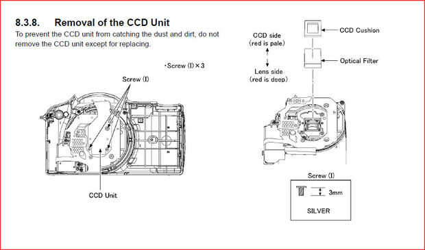 Abrir los tres tornillos que sujetan la unidad de CCD en el lugar, colocará las bisagras hacia arriba. Si te fijas debajo de él que vemos el filtro caliente al CCD con un pequeño rectángulo de esponja, elegir el filtro (que se ve rosado/azul) y quitar la esponja. Si cualquier bit ha caído sobre el sensor, limpiarlos apagado con el pincel. Poner el sensor en el lugar y el tornillo firmemente de nuevo.