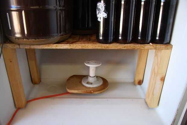 Durante los meses más cálidos cuando la temperatura ambiente es superior a la temperatura de fermentación deseada, la nevera va a hacer el enfriamiento.  Durante los meses más fríos necesito alguna manera para calentar la cámara.  Usa una barato $1 cerámica luminaria y había montado en un trozo de MDF de 3/4".  Que todas las costuras para hacerla agua firmemente como sea posible, y luego hizo unos pies levantarla fuera de la superficie inferior con tornillos siliconada.  Esto es por si acaso tengo un fermentador rebosante o explosión de la botella.  Luego compré una bombilla de cerámica infrarroja de una tienda de mascotas.  Normalmente son utilizados para terrarios de calor para serpientes y lagartos.  Cuando bajan las temperaturas, simplemente coloque la bombilla de calor debajo del estante y luego la conecte en mi controlador de temperatura.  La única desventaja es que no puedo ajustar tantas botellas debajo del estante a condición de botella durante los meses más fríos.
