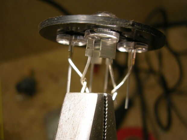 Gire la pierna altura de un LED a la pata corta de la siguiente. hacer esto tres veces para que dejas dos piernas intactas.