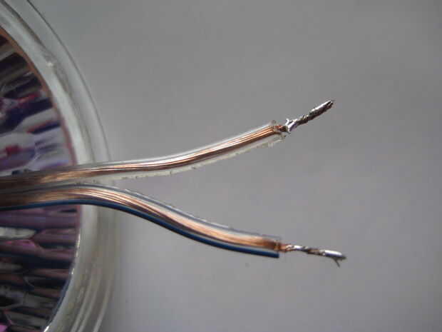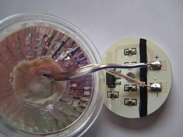 Ahora cortar el cable a la longitud deseada para poder encajar el cable detrás del disco de halógeno, tira de unos 5mm entonces el cable de la lata y luego la soldadura... recuerda no dejar el soldador en contacto largo... puede quemar los LEDs.