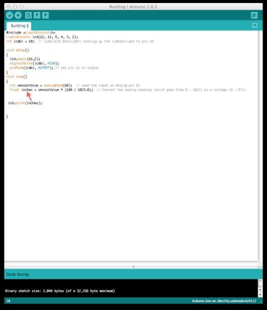 LCD.Print (pulgadas); Ahora ¿por qué pulgadas? Bueno, recuerde, nombramos la lectura analógica de A0 'pulgadas' así que esto es lo que es lo que debemos. No usar comillas, ya que citas es sólo para poner texto.