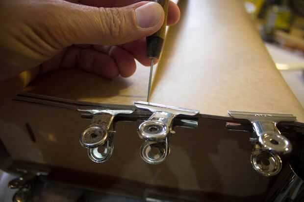 Aquí utilicé clips de carpeta oficina temporalmente sujetan la bolsa ya que encuentra la manija en el centro de la parte superior y marcar la solapa encuentro el frente. Marque ligeramente con un punzón de cero. Luego puede transferir estas marcas a su patrón para poder realizar otra vez la misma bolsa.