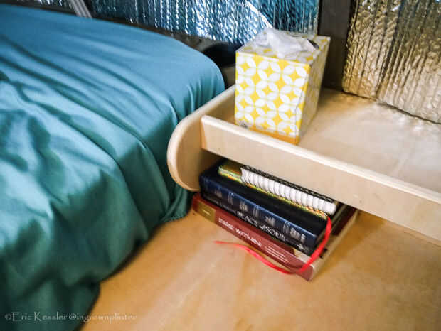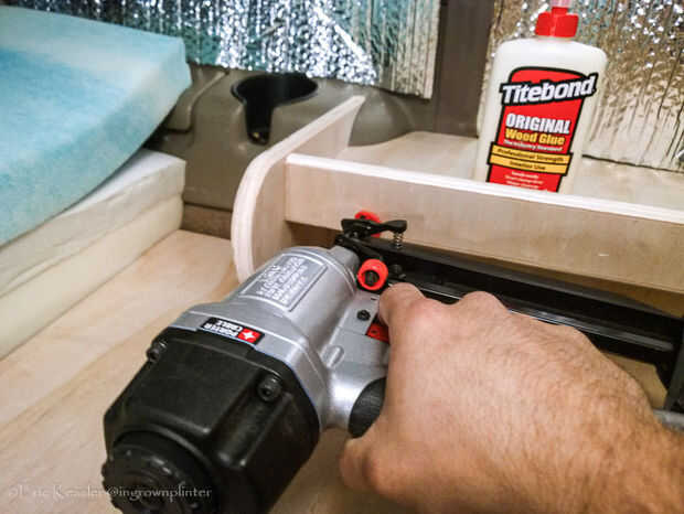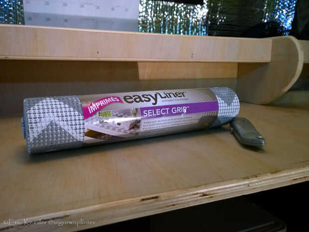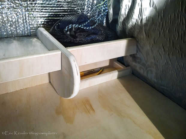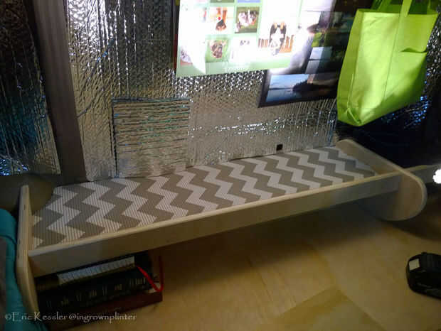 La mesa tuvo traza un poco más y formar para que las piezas de ajuste. Me aseguré de que los estantes y compartimientos tenían paradas en todos los lados, clavados en su lugar con una pistola de clavos de acabado. Estas paradas, en conjunto con liner grip (la clase significó para revestimiento de cajones) en todas las superficies ayudaría a mantener objetos estable mientras que la camioneta está en el camino.