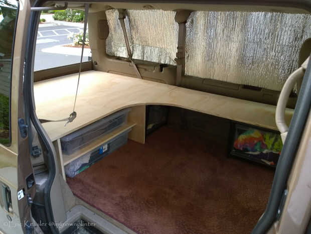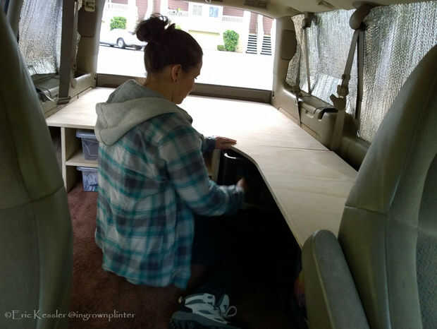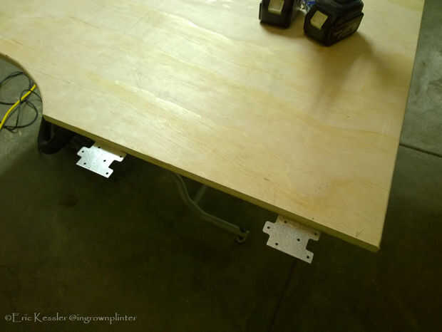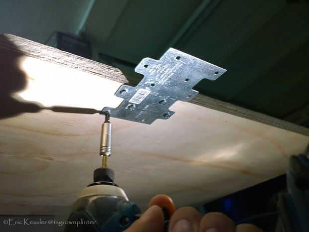 La plataforma de escritorio conectada a y parcialmente apoyada por la plataforma de la cama a través de dos planos Simpson chapas atornillado en la parte inferior de piezas y cerrar la costura.