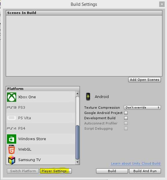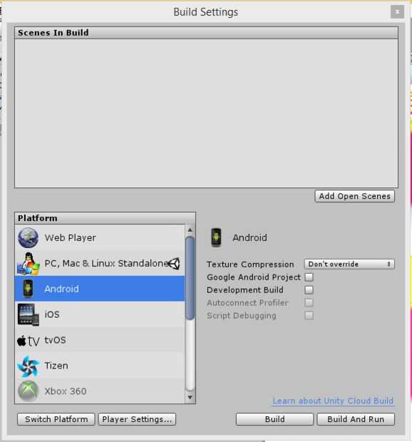 Usted está casi allí. Primero vas a archivo, configuración de construir. En la configuración necesita cambiar algunas cosas para que funcione la aplicación. Desea abrir otra programación, busque el texto largo (aparece arriba). Entonces usted quiere hacer que emparejan. Primero necesita cambiar com.Company.ProductName a com. DefaultCompany. lo que llamó su proyecto al principio sin espacios. A continuación, puede compilar el proyecto y seleccione android como la plataforma. Después, pedirá el SDK Android y JDK así que tenga los útiles. A continuación, desea mover la. APK archivo a su teléfono conectando el teléfono, luego encender el teléfono y desbloquear si contraseña. Debe aparecer en usted computadora que usted puede abrir la carpeta del teléfono, luego ir a descargas, luego ponerlo. Archivo APK allí.