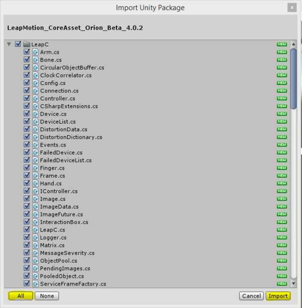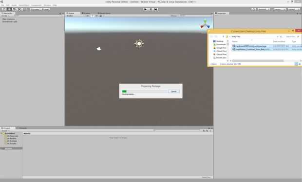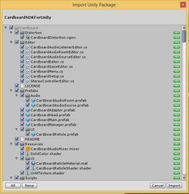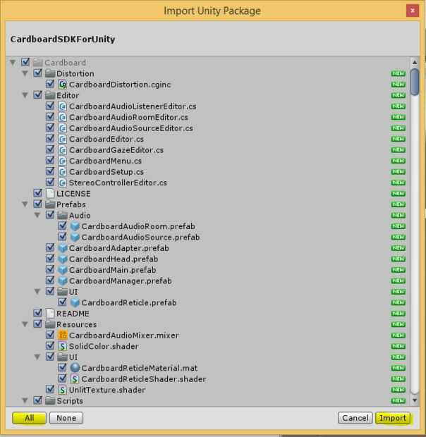 Sin complementos a nuestro mundo, no podrás hacer nada excepto mirar en la oscuridad. Tenemos que añadir activos para el movimiento de salto y el VR. Con los activos aquí, necesita arrastrarlos desde tu escritorio o la carpeta en a la parte inferior de la pantalla. Se cargar y mostrar una pantalla. Presione todos y luego pulse importar. Repetir este proceso para ambos activos.