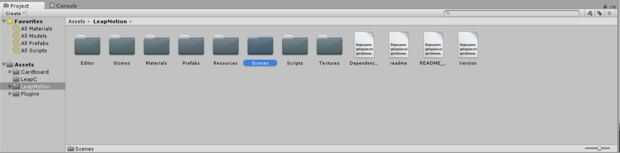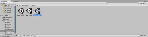 En primer lugar, quiere navegar por los archivos en la parte inferior y seleccione LeapMotion/escenas y luego desea recoger la cabeza montado Demo. Una vez que usted abre la escena, tarda unos segundos en cargar. Entonces usted quiere seleccionar LMHeadMountedRig, click derecho y copiar el objeto.