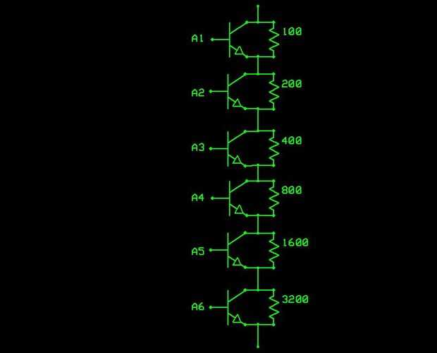 Mientras que el edificio debe elegir transistores NPN o PNP (creo que PNP trabajo mejor aunque he utilizado NPN) la primera foto es de una sola etapa, la parte superior parte inferior NPN PNP. El segundo muestra una cascada de 6 bits de 8 veces la resolución de una broca de 3! En la tercera foto se muestra cómo utilizar un único valor de resistencia para hacer la cascada y cualquier valor funcionará como utilizas 1 2 4 8 16 ect. resistencias. Esto es aún más exacta entonces usar predeterminados valores de la década. (ver más adelante la curva).