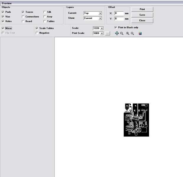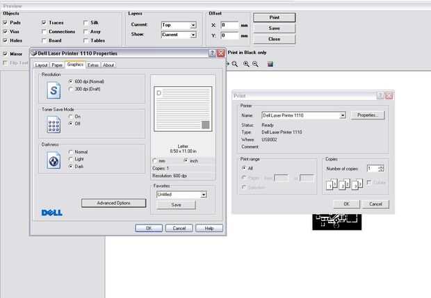 Descargar el archivo abajo (convertidor, SMT2) (usted tendrá que descargar el software gratuito DipTrace 2). Abra el archivo y haga clic en Vista previa de impresión en archivo. Asegúrese de que las selecciones de objetos son como se muestra en la imagen y la Caja del espejo está activada. Haga clic en imprimir, en la ventana de impresión , seleccione propiedades. En la ventana propiedades seleccionar la pestaña gráficos y en la Plaza de la oscuridad seleccione oscuro.