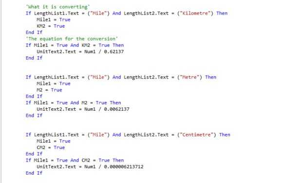 'What it is converting' If LengthList1.Text = ("Mile") And LengthList2.Text = ("Kilometre") Then Mile1 = True KM2 = True End If 'The equation for the conversion' If Mile1 = True and KM2 = True Then UnitText2.Text = Num1 / 0.62137 End If If LengthList1.Text = ("Mile") And LengthList2.Text = ("Metre") Then Mile1 = True M2 = True End If If Mile1 = True and M2 = True Then UnitText2.Text = Num1 / 0.0062137 End If If LengthList1.Text = ("Mile") And LengthList2.Text = ("Centimetre") Then Mile1 = True CM2 = True End If If Mile1 = True and CM2 = True Then UnitText2.Text = Num1 / 0.0000062137 End If If LengthList1.Text = ("Kilometre") And LengthList2.Text = ("Mile") Then KM1 = True Mile2 = True End If If KM1 = True and Mile2 = True Then UnitText2.Text = Num1 * 0.62137 End If If LengthList1.Text = ("Kilometre") And LengthList2.Text = ("Metre") Then KM1 = True M2 = True End If If KM1 = True and M2 = True Then UnitText2.Text = Num1 / 0.001 End If If LengthList1.Text = ("Kilometre") And LengthList2.Text = ("Centimetre") Then KM1 = True CM2 = True End If If KM1 = True and CM2 = True Then UnitText2.Text = Num1 / 0.000001 End If If LengthList1.Text = ("Metre") And LengthList2.Text = ("Mile") Then M1 = True Mile2 = True End If If M1 = True and Mile2 = True Then UnitText2.Text = Num1 * 0.000621317 End If If LengthList1.Text = ("Metre") And LengthList2.Text = ("Kilometre") Then M1 = True KM2 = True End If If M1 = True and KM2 = True Then UnitText2.Text = Num1 / 1000 End If If LengthList1.Text = ("Metre") And LengthList2.Text = ("Centimetre") Then M1 = True CM2 = True End If If M1 = True and CM2 = True Then UnitText2.Text = Num1 / 0.01 End If If LengthList1.Text = ("Centimetre") And LengthList2.Text = ("Mile") Then CM1 = True Mile2 = True End If If CM1 = True and Mile2 = True Then UnitText2.Text = Num1 * 0.000000621317 End If If LengthList1.Text = ("Centimetre") And LengthList2.Text = ("Kilometre") Then CM1 = True KM2 = True End If If CM1 = True and KM2 = True Then UnitText2.Text = Num1 * 0.00001 End If If LengthList1.Text = ("Centimetre") And LengthList2.Text = ("Metre") Then CM1 = True M2 = True End If If CM1 = True and M2 = True Then UnitText2.Text = Num1 * 0.01 End If 'If converting into same unit then the valve will be the same' If LengthList1.Text = LengthList2.Text Then UnitText2.Text = Num1 End If