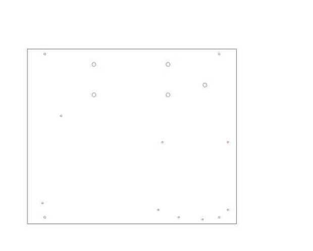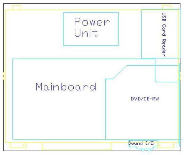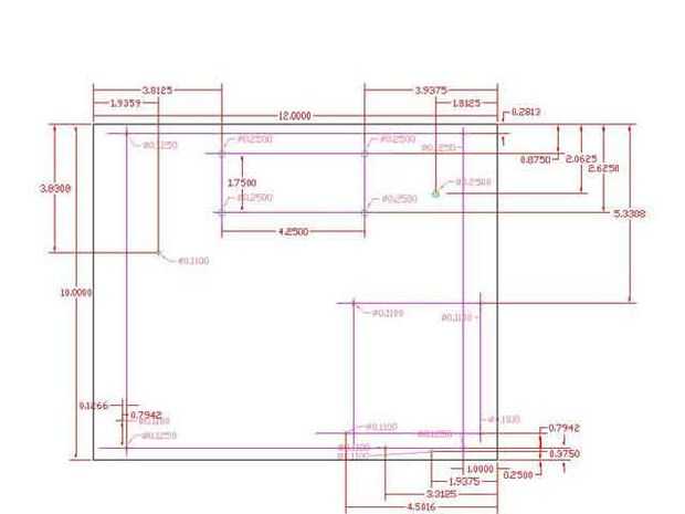 Después de la medición de esta Asamblea, la unidad de DVD y las dimensiones de la pantalla, pudo elaborar el siguiente conjunto de DXF (cortesía de QCad. Gracias Knoppix!). La imagen principal muestra un diseño de colores de los componentes. La segunda imagen muestra las dimensiones de los orificios de montaje y sus ubicaciones. La imagen final muestra la placa con orificios, libres de líneas de dimensión.