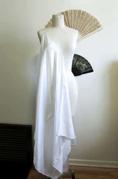 • Estas bufandas crepé de China tienen un lado brillante y un lado mate y decidí tener el lado mate hacia fuera para la mayoría de la vestimenta. Va a ser secciones (las esquinas de las plazas) del vestido que puede ser dado vuelta al interior y cortado, para hacer una silueta más simple, más suave o a la izquierda hacia el exterior para crear movimiento extra y drapeado opciones. Mostraré ejemplos de ambas opciones.
