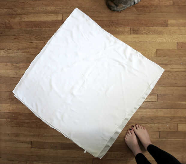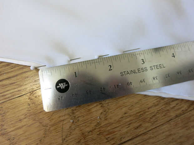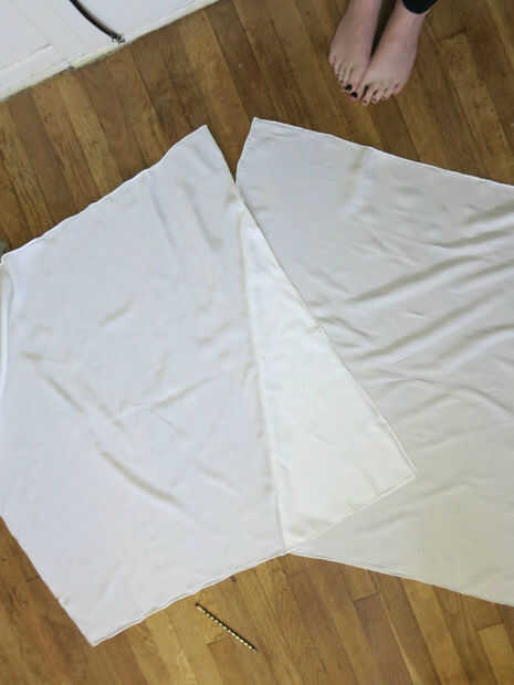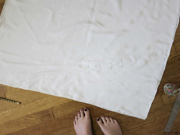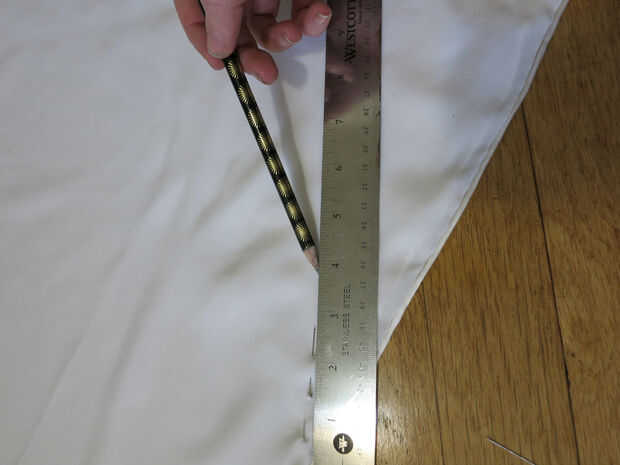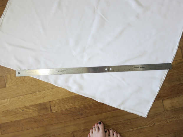 Tampoco habrá cubrió tu pañuelo en el centro donde se reunieron en el paso 1, o usted puede medir la distancia desde la parte superior de las bufandas a donde le gustaría a unirse en el centro. A partir de ese pin, tomar su regla y poner a través de los pañuelos, haciendo un triángulo a un pin en cerca de 9" de la esquina #2. Se trata de la costura central hacia abajo la parte delantera de su vestido. Dibujar una línea a lo largo de su regla con el lápiz o tiza de modista y luego prender las dos bufandas, mismos lados juntos, cuidadosamente a lo largo de esa línea.
