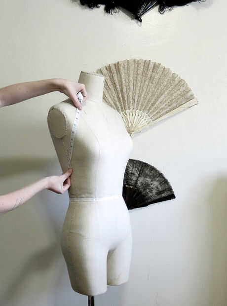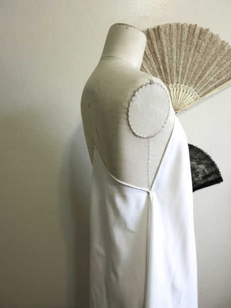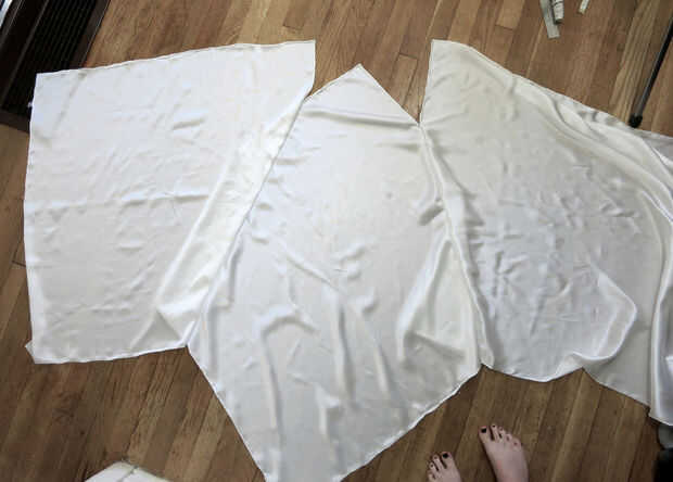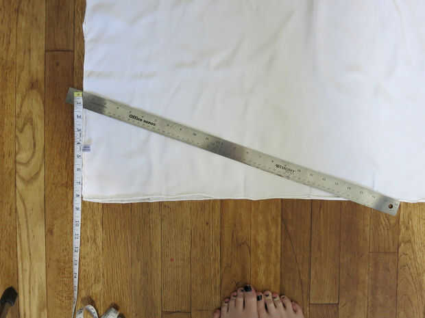 Ahora a coser la primera costura lateral, haciendo básicamente lo mismo que hiciste antes, agregar C bufanda a sus dos primeras bufandas. Desea medir cómo baja usted quiere el agujero del brazo para ser (mina era de 9" o 10") y marcar esa distancia de la esquina #1 de C bufanda con su lápiz. Entonces, al igual que antes, pone bufanda A y C de la bufanda, mismos lados uno frente al otro. Trace una línea para hacer un triangulo que conecta a la marca que acaba de hacer a otra marca, otra vez, unos 9" de la esquina #2 de las bufandas. Prender a lo largo de esta línea, y luego cose, como antes. Ahora tienes tres bufandas, acompañados de dos costuras y usted comenzará a ver la forma que está tomando su vestido-se convertirá en un tubo con tres lados, con todos tres esquina #1 punto.