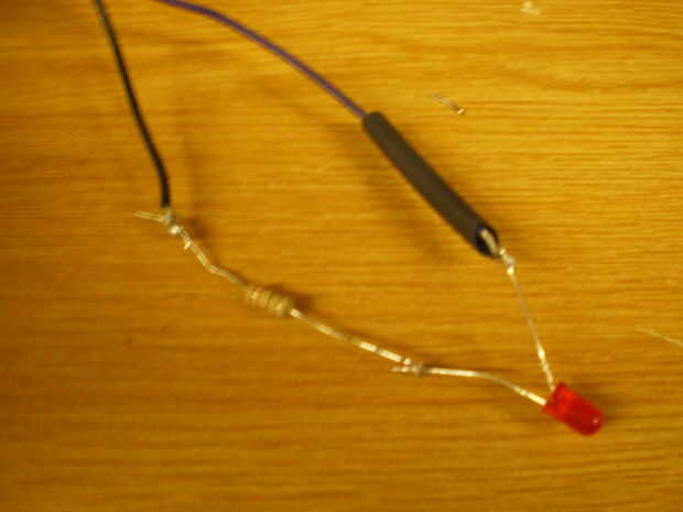 Si desea agregar un espera o una corriente en el LED tendrá un LED (rojos recomendadas pero no una necesidad) y una resistencia de Ohm 330. Soldar un cable negro con un extremo de la resistencia y la pata corta del LED al otro. La resistencia, la tensión disminuye hacia abajo para evitar que dañar el LED. Antes de que otro soldado opcionalmente deslizarse en un poco de encogimiento del calor de la tubería para evitar cortocircuitos. Soldar el cable morado en la pierna más larga y al conectarlo pero no enciende, debe encender.