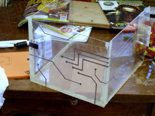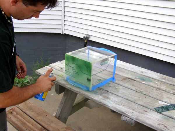 No quiero mirar el plástico gris mate del interior de un monitor de la computadora, así que el siguiente paso que hice fue pintar en el exterior de la pecera de Plexi. Empecé teniendo un marcador permanente Sharpy plata y un cuadrado de la velocidad y sacó algunas líneas de circuito (otra vez en el exterior). I luego un Sharpy verde para añadir algunas sombras bajo estas líneas. Finalmente enmascarados fuera de los bordes y el aerosol pintado exterior con alguna pintura en aerosol verde barato (por supuesto usted podría pintar lo que quieres).