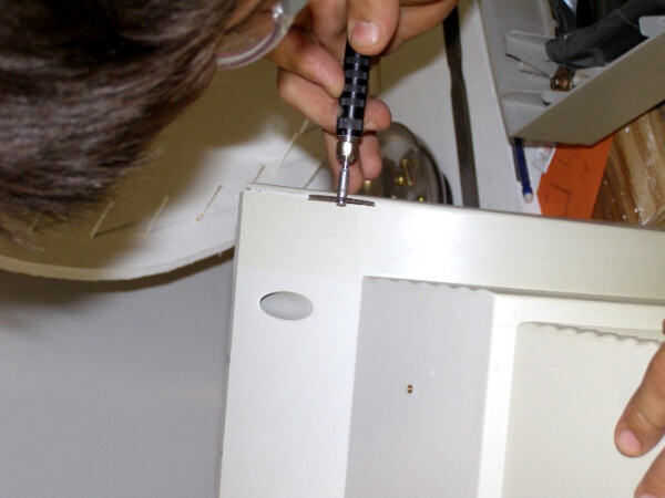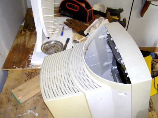 Para hacer el panel de acceso utiliza una herramienta rotativa con la broca de corte y corte cuidadosamente a lo largo del borde superior de la parte superior del tanque. Esto le ha permitido fijarse deslizando el, ya presente, pestañas en la parte delantera del monitor plástico vivienda.