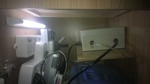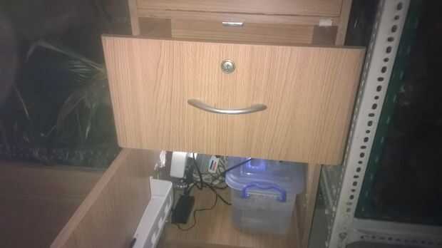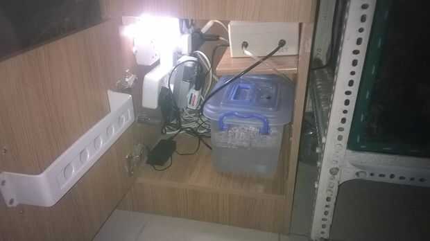 Una vista dentro del recinto, donde puse el temporizador, bomba y tanque y otros iluminación, pequeña estantería para diferentes usos y también cajones para cualquier alimento... etc.