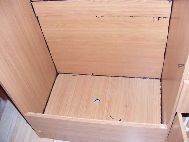 Después de quitar las puertas, cajones, hacer los agujeros por sierras para taladro para drenaje