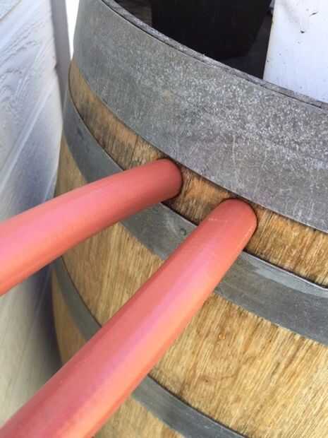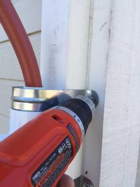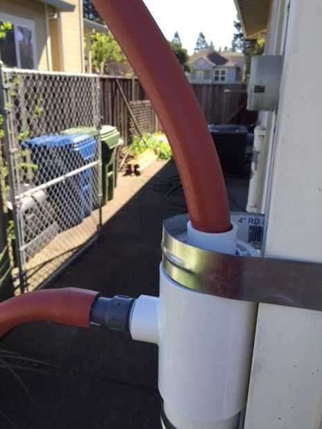 La manguera que es un estándar de 1" jardín, cortado a longitudes apropiadas, entre 1 1/2-2 1/2 pies en la mayoría de los casos. Encontramos manguera era el tamaño adecuado y el material; Tenga en cuenta que algunos de ellos son sólo 3/4" y dejarían un vacío en el orificio de entrada. Ya que no quiere errores en el cañón, no comprometer el tamaño de la manguera - debería encajar perfectamente en los orificios perforados entre bordes de metal, en la captura de sedimentos de pvc y en el pequeño adaptador de pvc conectado al desviador.