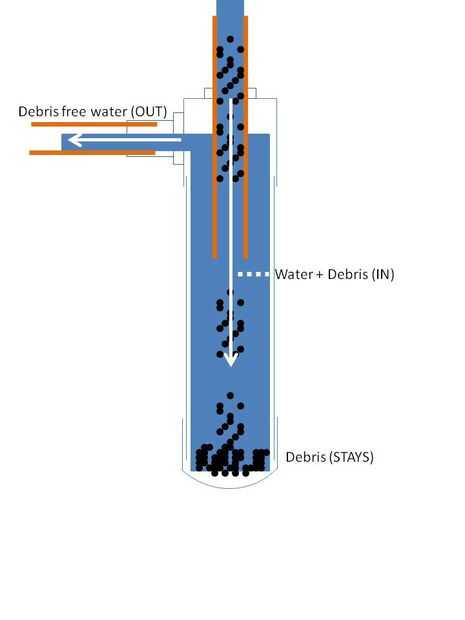 El principio básico es que la longitud del PVC y el flujo del agua permiten las partículas sólidas (pequeños guijarros, rocas, tierra) para recoger en la parte inferior, como el agua corre a través de una conexión de la manguera en la parte superior. Se espera que tendremos que reemplazar estos cada 3-5 años como sedimento se acumula si un tope, o utilice el adaptador de limpieza de PVC con piezas desmontables y limpiar hacia fuera una vez al año. No es perfecto, pero ha funcionado bien hasta ahora.