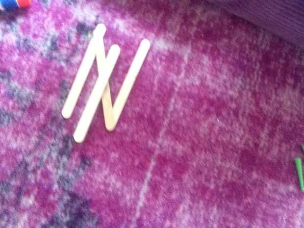 Para éste tendrá que forma N con palitos y pegamento. Luego poner otros 2 palos y pegarlos uno encima del otro luego pegar dos palos en el N.