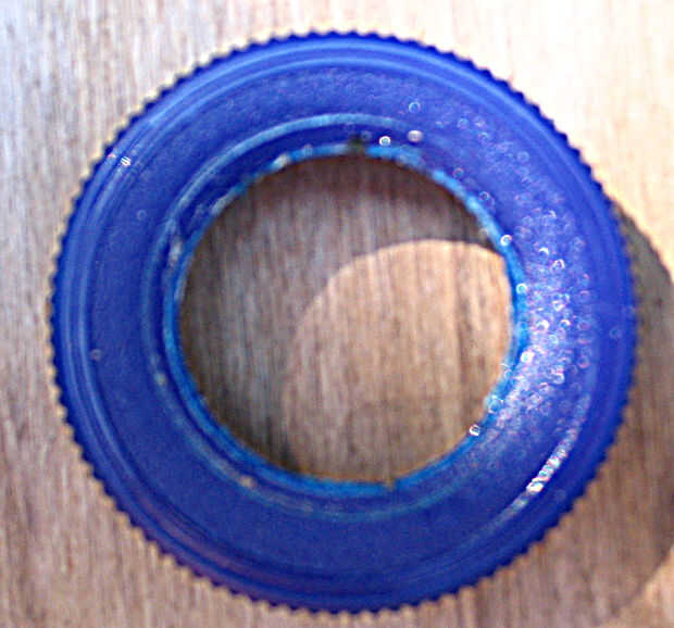 Con esta herramienta perforé las tapas de botella azul. No sé cómo se llama, el tamaño es de 22mm (7/8) y se puede adquirir en cualquier ferretería. Me imagino que la misma caña resultado lograrse con la pipa de calefacción del mismo diámetro.