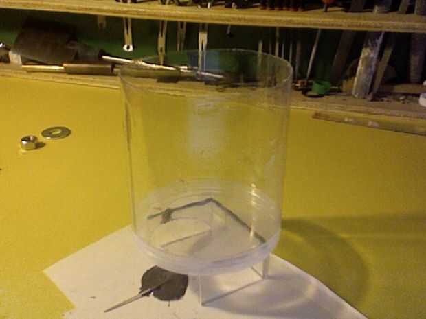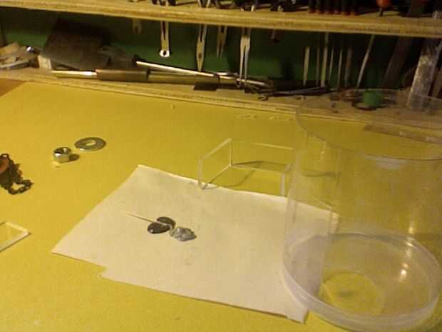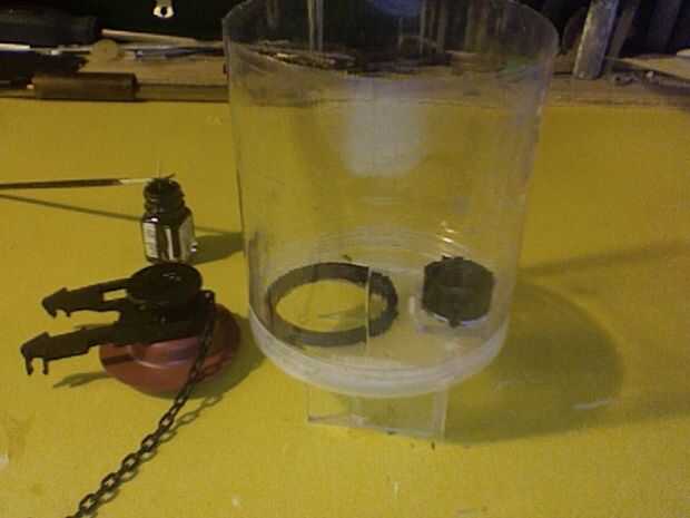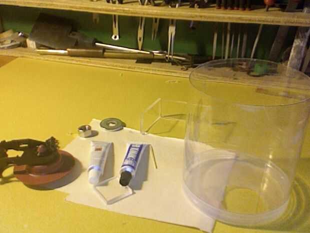 Empezar por preparar todas las piezas para pegar. El epoxi se convierte en firme rápidamente y le da sólo tres minutos para alinear las piezas. No quieren buscar una parte con el pegamento de secado rápido, así que organizar todas las piezas antes de la mano: la jarra de tres patas, el peso, la aleta, la 1x 1x 1/4 cuadrado plástico; y el cuello. Cuando todo esté listo, mezclar a partes iguales de epoxi y el catalizador, luego aplicar a todas las superficies a unir. Finalizar pintando la lavadora ya sea epoxi o pinturas con base de aceite.