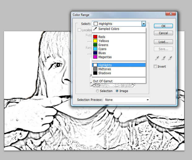 Ahora tenemos que borrar el espacio en blanco de nuestro esquema para que podamos ver la capa original por debajo. Con la capa de perfil todavía seleccionado ir a selección -> gama de colores y seleccione "Destacados" una vez que usted haga clic en aceptar, presione la tecla Del teclado. Ahora debe ver la capa original por debajo.  Posiblemente necesite resistente lo para arriba un poco con el borrador para eliminar las líneas no deseadas.