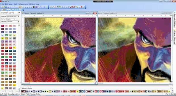 La segunda imagen muestra la diferencia entre un filtro de ruido aplicado y sólo lanzar la imagen directamente en su software de puntada. El de la izquierda tiene mejor mezcla entre los colores, donde el de la derecha tiene bordes muy duros. Puesto que hay solamente cerca de 450 colores de seda en la tabla de DMC y aún menos colores para otras marcas, las diferencias entre los colores pueden ser muy dramáticas cuando poner uno junto al otro en las bandas de sólidos.