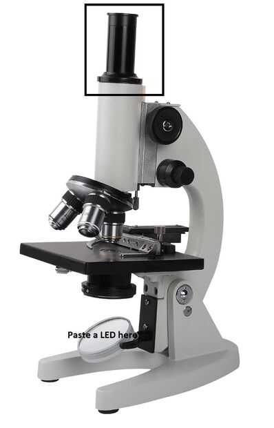 Este es mi microscopio, primero retire el ocular o quitar el tubo completo como sección que marqué para el mejor resultado, puede quitar que tubo como la estructura, extrayendo sólo, este método es adecuado para la mayoría de los microscopios. y también añadir un LED con un interruptor y una batería (no olvide agregar una resistencia para evitar la quema de LED).