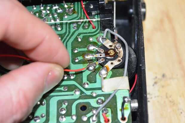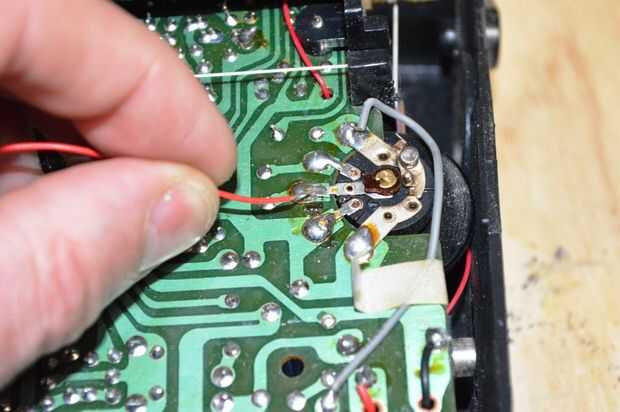 3. ahora con tu guitarra enchufado en el conector de entrada, prueba cada una de las almohadillas de soldadura en el pote de volumen. Coloque el cable en uno, rasguear la guitarra y si no pasa nada el siguiente hasta que oiga la guitarra sale de la radio.