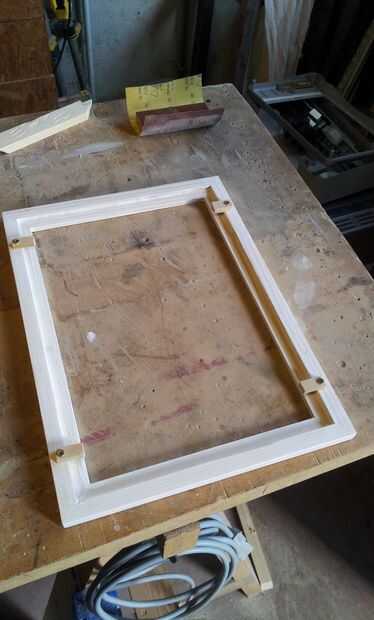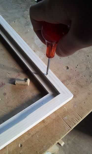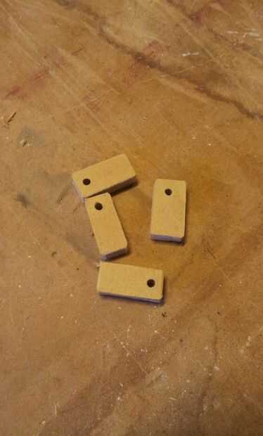 Para sujetar el cristal, la imagen y el fondo, hice cuatro retenedor poco cosita ese tornillo en su lugar todo alrededor del marco. Cada uno de estos retenedor está hecho de chatarra MDF, es bastante sencillo de hacer ya que es exactamente un rectángulo con un orificio de compensación en un lado.