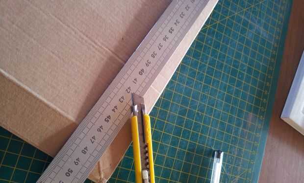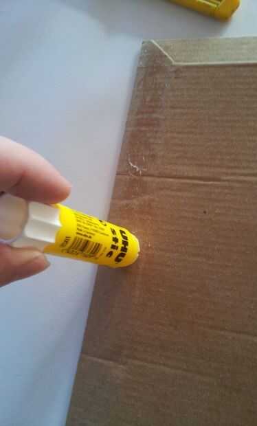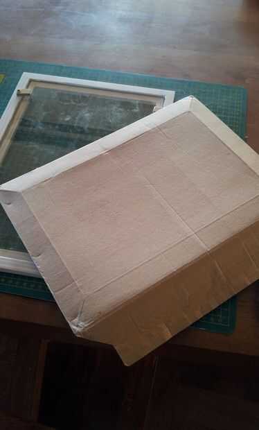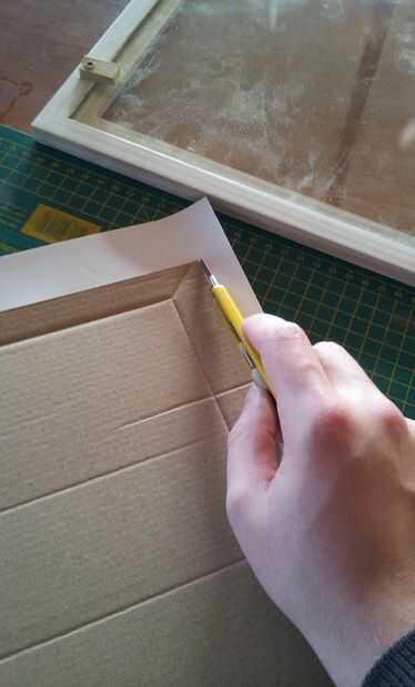 Para el fondo blanco, pegada con la motivación de cero costo y decidió volver a envolver un cartón viejo. Es sólo una cuestión de cortar el cartón a la dimensión con un borde recto y un cuchillo y pegar alrededor del borde de una hoja de papel blanco.